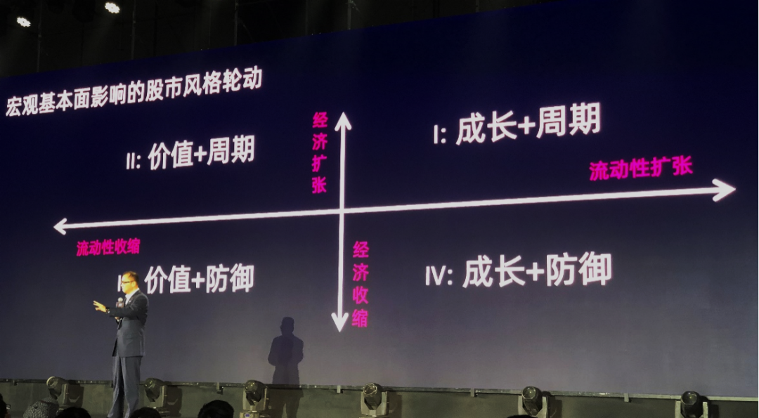 “如果明年全球经济同步复苏,强于预期,不排除流动性环境的收紧会早于预期,如果是这样,那么在明年某个时间点有可能进入到第二象限,也就是左上角的价值+周期象限。”