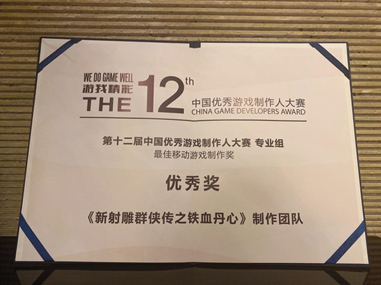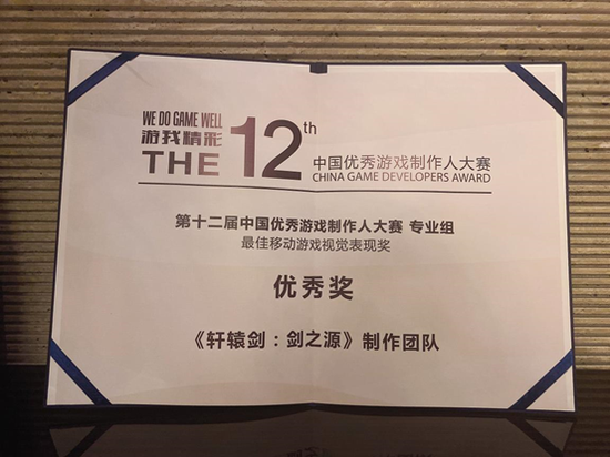 12月9日,第十二届CGDA优秀游戏制作人大赛颁奖典礼在北京隆重举行。全球化IP游戏运营商中手游表现出色,参加角逐的《新射雕群侠传之铁血丹心》制作团队和《轩辕剑:剑之源》制作团队,分获“最佳移动游戏制作奖”和“最佳移动游戏视觉表现奖”。
