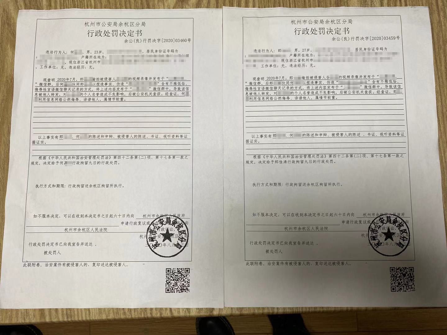 8月13日,杭州市公安局余杭分局作出行政处罚书,“经查证,郎某与何某利用信息网络公然侮辱、诽谤他人,属情节较重。”郎某和何某被行政拘留9日。