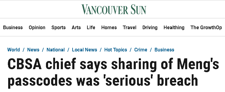 10日当天,温哥华当地报纸《温哥华太阳报》使用《边境服务局主管说分享孟的密码属严重违规》的标题报道了古德曼如何处理下属把孟晚舟手机密码泄露给警方的事。
