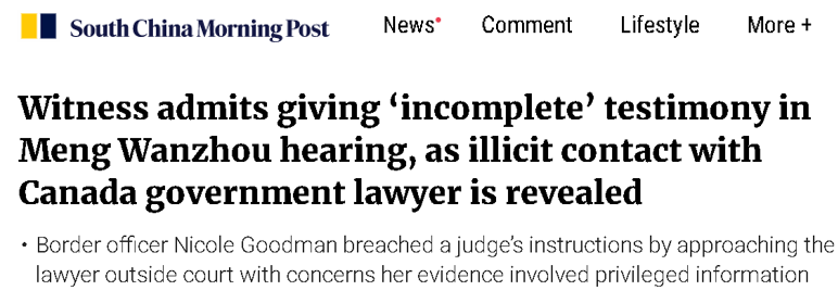 《南华早报》当天也以《证人承认在孟晚舟案听证中提供不完整证言,以及违规与加拿大检方律师接触一事亦被公开》为标题及时报道了此事。