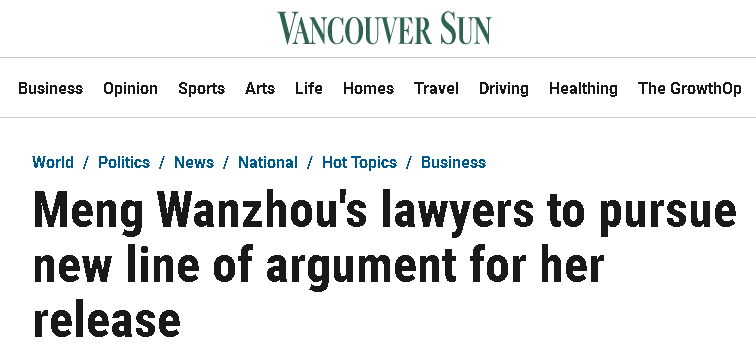 《温哥华太阳报》10日报道的标题《孟晚舟的律师为其获释寻求新的申诉理由》