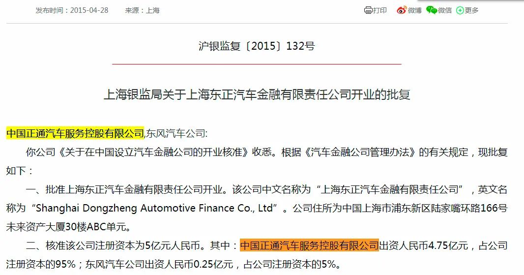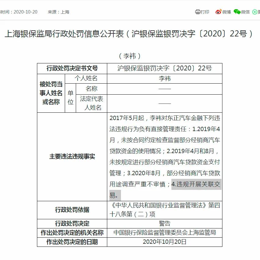 2015年4月,中国正通汽车服务控股有限公司设立上海东正汽车金融有限责任公司。今年10月,上海东正汽车金融公司因违规开展关联交易被上海银保监局处罚。