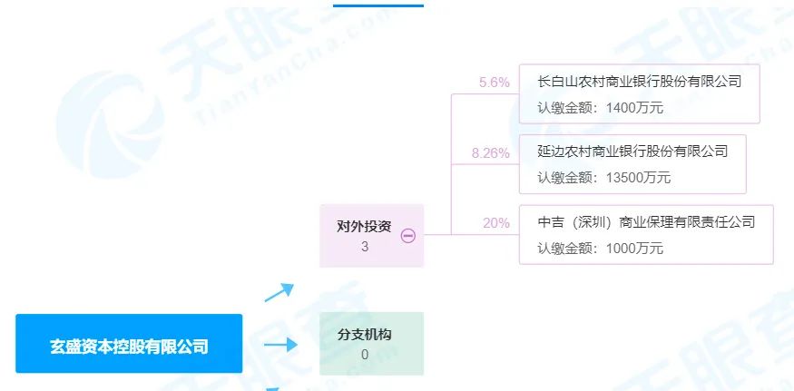 天眼查信息显示,玄盛资本控股有限公司分别持有长白山农村商业银行、延边农村商业银行5.6%、8.26%的股权。