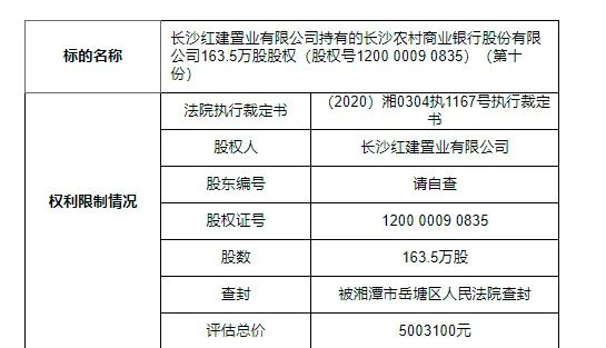 阿里拍卖网显示,长沙红建置业有限公司持有的长沙农村商业银行股份有限公司163.5万股股权已被湘潭市岳塘区人民法院查封。相关信息显示,这笔拍卖已显示“流拍”。