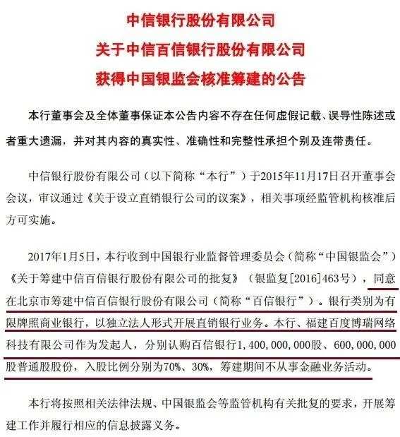 2017年11月18日,由中信银行与百度联合发起设立的百信银行正式开业,它还有两个特殊标签:全国首家独立法人直销银行、唯一国有控股的互联网银行。