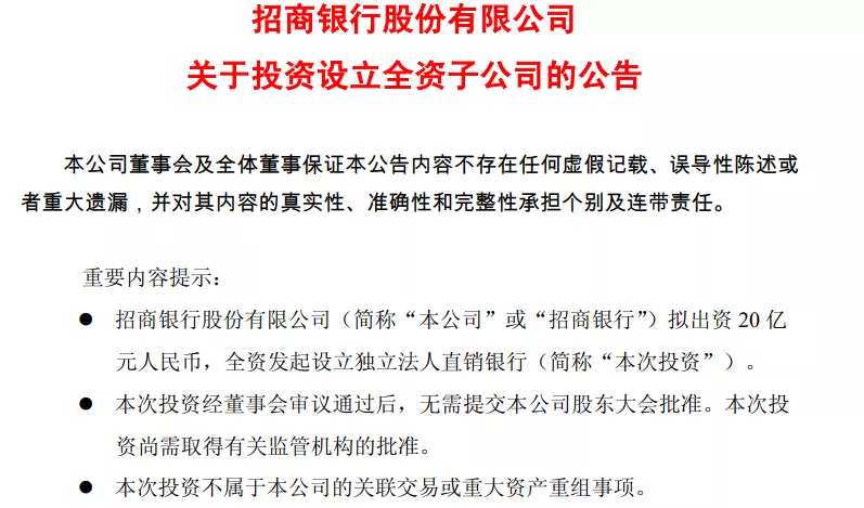 2018年3月的董事会上,招商银行就审议通过了《关于以合资方式发起设立独立法人直销银行的议案》。