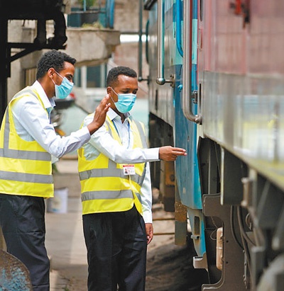 中国修建了非洲第一条跨国电气化铁路——亚吉铁路,不仅为相关国家和地区提供了发展机会,其节能环保的运行模式也成为共建绿色“一带一路”的最佳注脚。图为两名埃塞俄比亚学员在中国接受电力机车驾驶专业培训时进行机车检查作业练习。