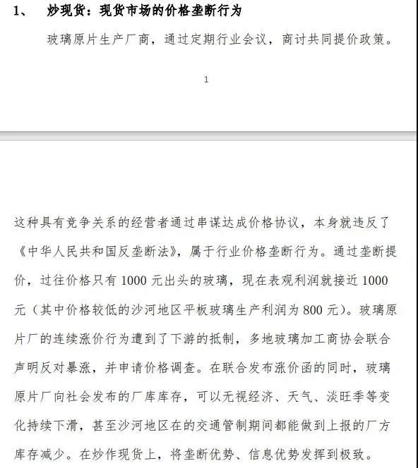 该举报信提及,在联合发布涨价函的同时,玻璃原片厂向社会发布的厂库库存,可以无视经济、天气、淡旺季等变化持续下滑,甚至沙河地区在的交通管制期间都能做到上报的厂方库存减少。玻璃原片生产厂商,通过定期行业会议,商讨共同提价政策。通过垄断提价,过往价格只有 1000元出头的玻璃,现在表观利润就接近1000元(其中价格较低的沙河地区平板玻璃生产利润为800元)。