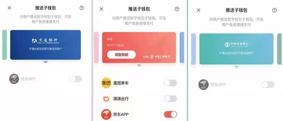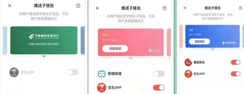 根据开通子钱包的银行不同,用户可选择的商户也会有所不同:本次试点活动中,工商银行、中国银行、建设银行、农业银行、交通银行、邮储银行开设的“子钱包”都可推送至京东APP,以实现支持数字人民币的线上线下交易;此外,建设银行子钱包能推送至“善融商务”(建设银行旗下B2C购物平台);中国银行子钱包能推送至哔哩哔哩;工商银行子钱包能推送至美团单车和滴滴出行。