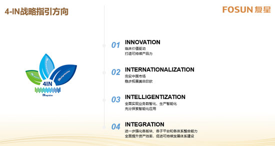 业务方面就不多讲了,复星医药是全产业链布局,从药品的研发、制造、医疗器械、诊断到医疗服务等等。然后是我们的4-IN战略指引方向。