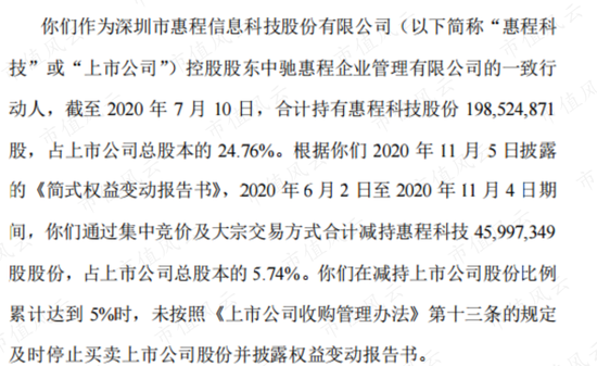 从11月13日交易所发的监管函来看,惠城科技大股东在减持超过5%的时候,还没披露权益变动书,风云君真是醉了。