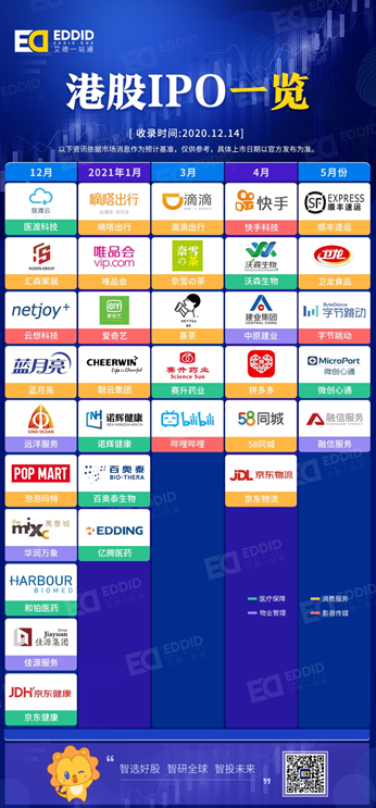除了中概股之外,艾德证券期货也同时观察到有多个热门新股拟于明年赴港上市。综合市场消息,预计2021年1月港股招股的企业有嘀嗒出行、诺辉健康等;预计2月及之后港股招股的热门企业有快手科技、奈雪、京东物流、卫龙食品等。