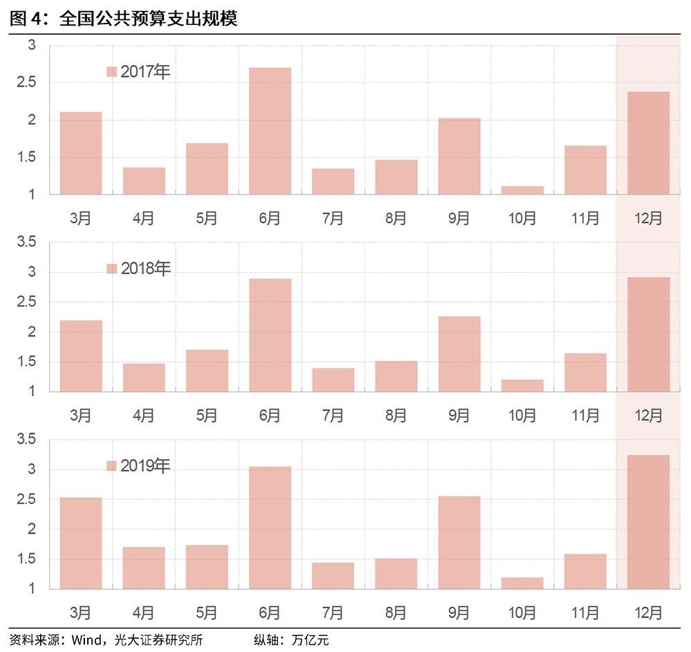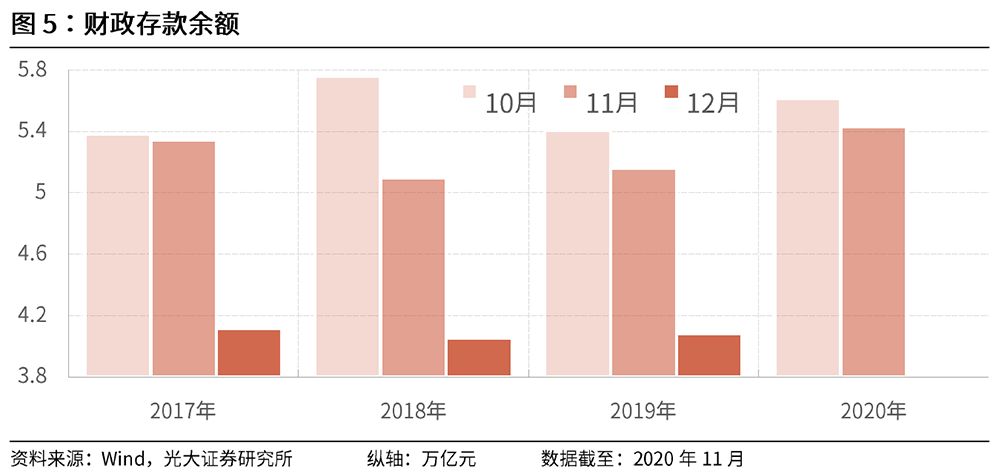 第二,未来财政支出加速有利于中长期流动性回流银行体系。事实上,历年12月中下旬均为财政大量支出的时点,今年亦不会例外。今年11月末财政存款的余额为5.4万亿元,按照往年的规律,至年底时会压降至4.1万亿元之下,以此估算,12月会形成超过1万亿元的财政存款回流。