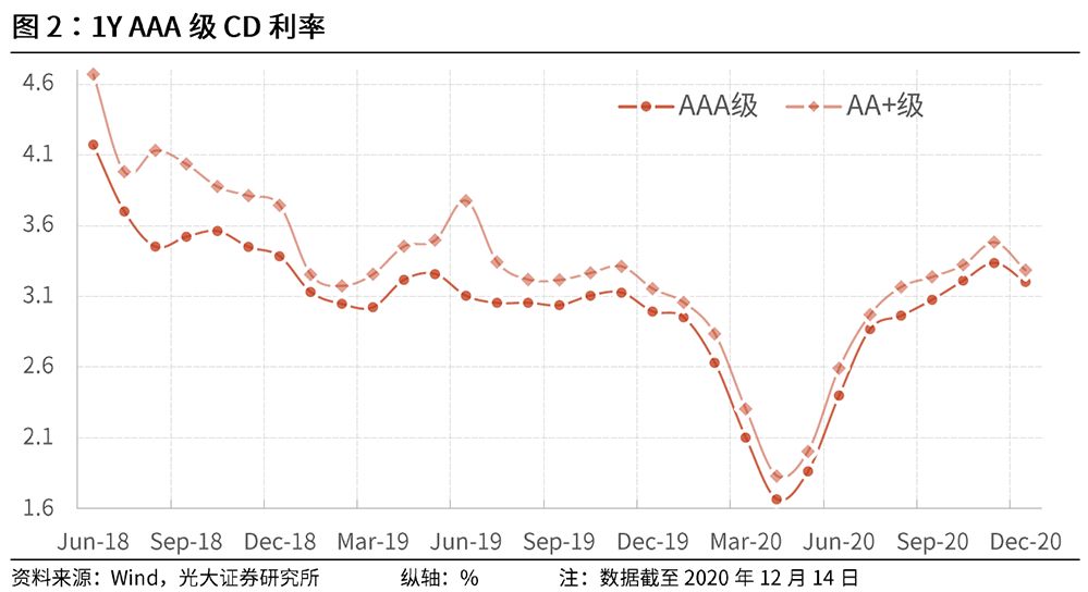 我们一直强调,MLF操作的规模与该时点1Y CD-1Y MLF之间的利差正相关,其内在逻辑是:1Y CD与MLF之间的利差反映出银行体系对于中等期限资金的渴求程度,而MLF正是央行向银行体系提供中期资金的主要工具。随着CD利率的上行,MLF操作的规模亦会进一步扩大,起到稳定市场中期利率的作用。所以,12月14日(即本次MLF操作前)1Y AAA级CD与MLF之间的利差达到24bp,MLF的投放量亦会相应提高以满足金融机构的需求。目前1Y AAA级CD利率正处于去年年初以及年中的水平,我们认为此时不妨乐观一点。