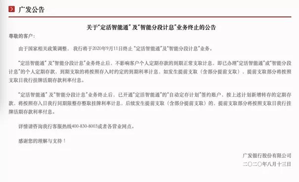8月,广发银行发布公告称,由于国家相关政策调整,该行将于2020年9月11日终止“定活智能通”及“智能分段计息”业务。公告显示,上述业务终止后,不影响客户个人定期存款的到期正常支取计息,即已办理“定活智能通”或“智能分段计息”的个人定期存款,到期支取的将按照存入时约定的到期利率计息,如发生提前支取(含部分提前支取),提前支取部分将按照支取日该行挂牌活期存款利率付息。