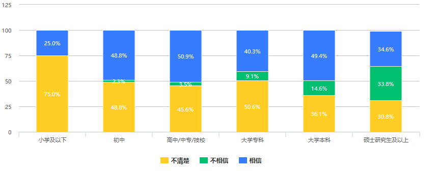 从学历看,硕士研究生及以上学历中,不相信数字人民币能可控匿名的人群比例最高,达到33.8%,而小学及以下学历的调查者选择该选项的人数为0。