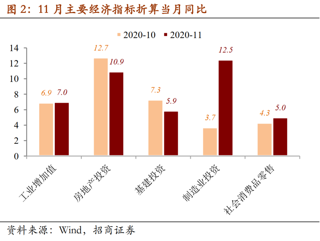 制造业“后来居上”。从主要指标看,①房地产和基建投资双双回落。11月房地产投资折算当月同比为10.9%(前值12.7%),制造业投资折算当月同比为5.9%(前值7.3%),二者的“先发优势”在减弱。②消费继续回升,但基本上延续10月以来的回升趋势,并没有明显加速。11月社会消费品零售同比为5.0%(前值4.3%)。③工业增加值是一个“亮点”。11月工业增加值同比自6.9%上升至7.0%,其中,制造业增加值同比自7.5%上升至7.7%。对于工增这样非春节月份几乎“走平”的指标来说,0.1个百分点的提升也是值得肯定的。④制造业投资是另一个“亮点”。最出乎意料的,莫过于11月制造业投资折算当月同比自3.7%大幅上升至12.5%,创自身2018年11月以来新高,并超过了同期房地产和基建投资增速。