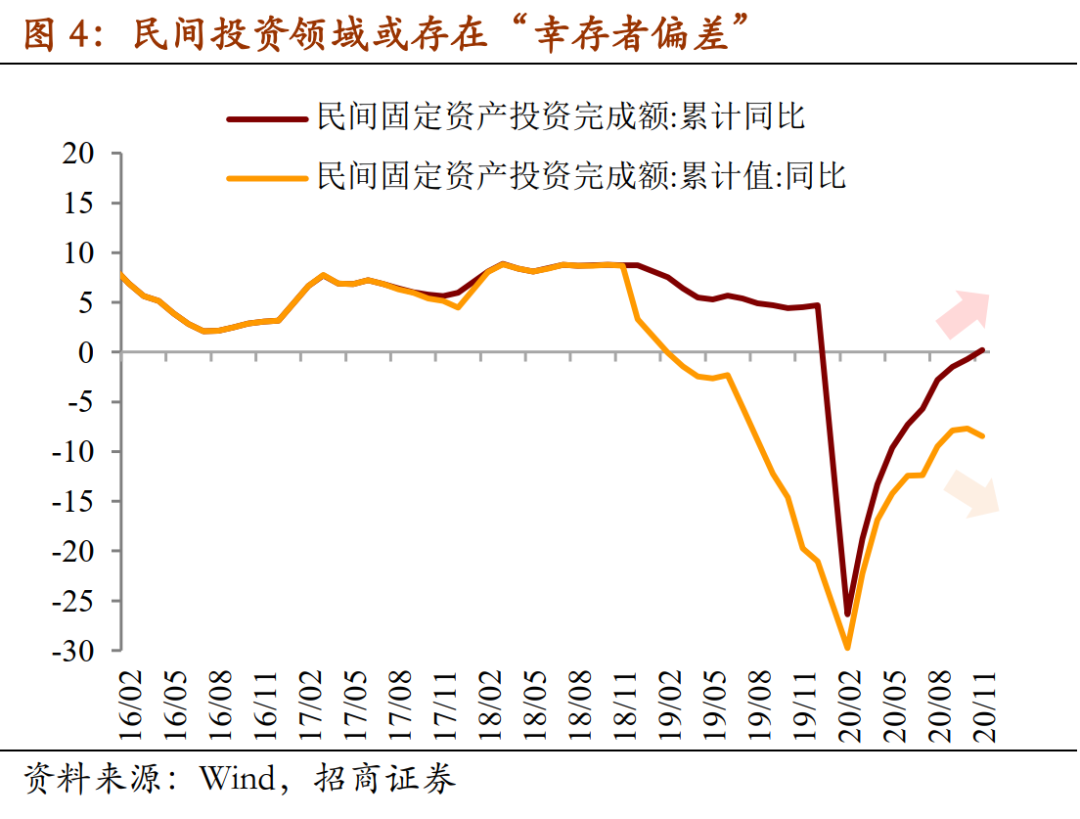 按照这一思路,凡是设定“统计门槛”的数据,如果为了保证可比性而进行样本剔除,理论上都存在“幸存者偏差”。今年以来,我们注意到,工业企业利润数据的偏差已经基本消失了,前10个月利润累计同比和累计值同比分别为0.7%、-0.05%。然而,固定资产投资数据(统计门槛是计划总投资500万元以上,房地产投资除外)却出现了明显的偏差。尤其是民间投资,前11个月按统计局公布的累计同比为0.2%,即年内首次实现“民间投资转正”,但按累计值计算的同比为-8.5%,且本月出现了自3月以来的首次同比下滑。换言之,如果“幸存者偏差”成立的话,今年以来大型的民间投资项目有明显“退潮”,真实情况可能不及数据本身乐观。