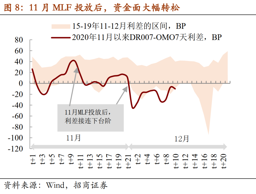 ②不同的是,这次基本面和资金面的信息“冲突”并不强烈,所以市场判断方向的过程中也许少了些“纠结”。毕竟与52.1的PMI相比,11月经济数据虽然延续复苏,但是强度一般,甚至有些低于预期(国债期货在数据发布后短线拉升,10年主力合约上涨0.24%);反而是9500亿元的MLF操作,不仅高于此前市场传闻的8000亿元,而且创有记录以来的新高,显然更容易被纳入定价。