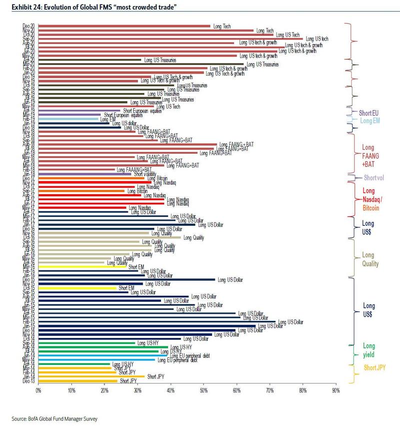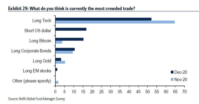 但是,尽管有31%的受访经理认为估值较低的价值股可以跑赢成长股,做多科技股仍然是当前最拥挤的交易,其次是做空美元。