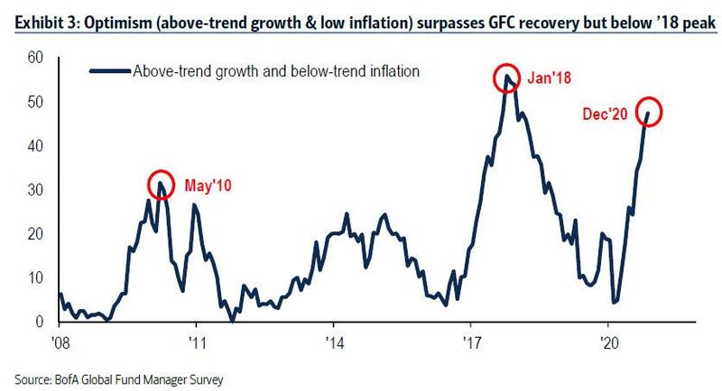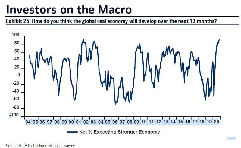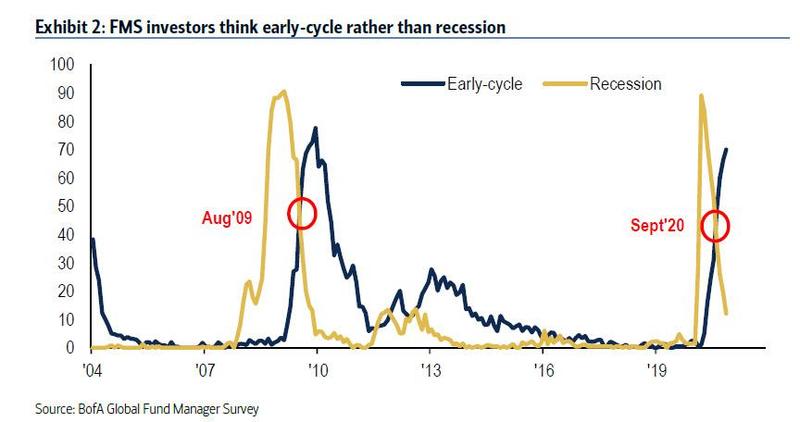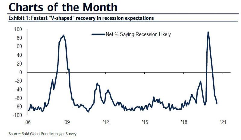 美国银行表示,现金水平下降和乐观的成长前景表明,市场预期初期的经济复苏将类似于2008年金融危机和互联网泡沫之后的情况。这些策略师说:“对经济复苏速度和幅度的预期都超过了先前的衰退。”