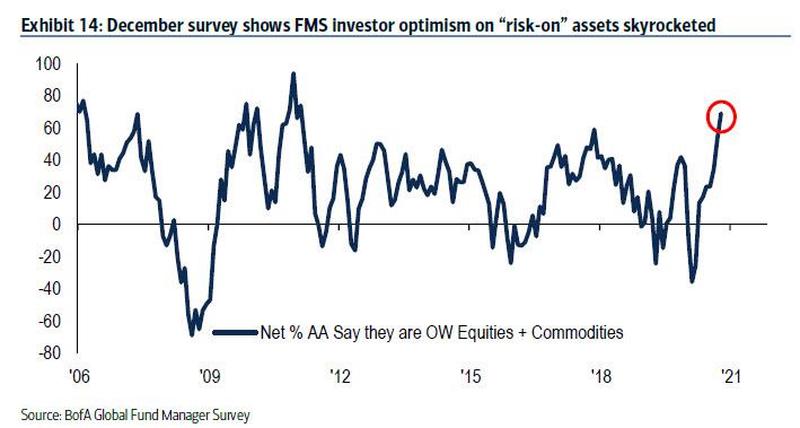 据美国银行称,投资者对股票、大宗商品等所谓风险资产的看涨程度已达到2011年2月以来最高。