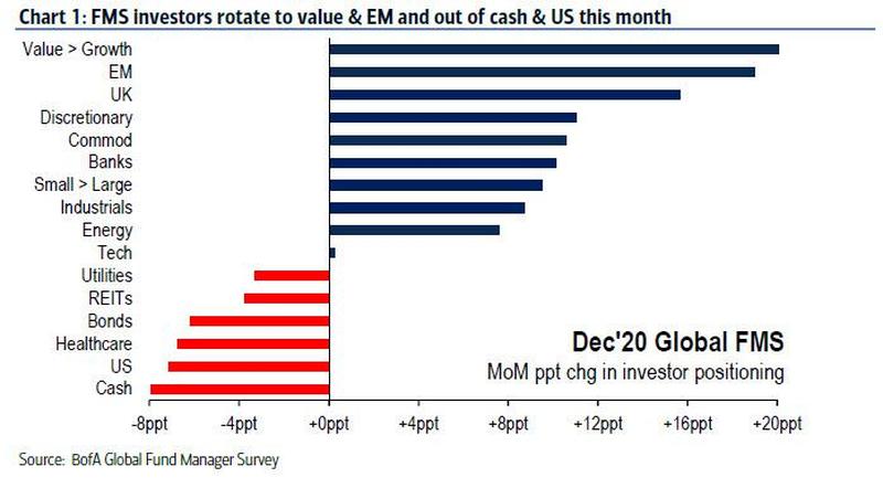 减少现金之际,资管经理们正涌向价值股,新兴市场,英国、银行股和非必需消费品股,减少了对美国、医疗健保股票以及债券的敞口。
