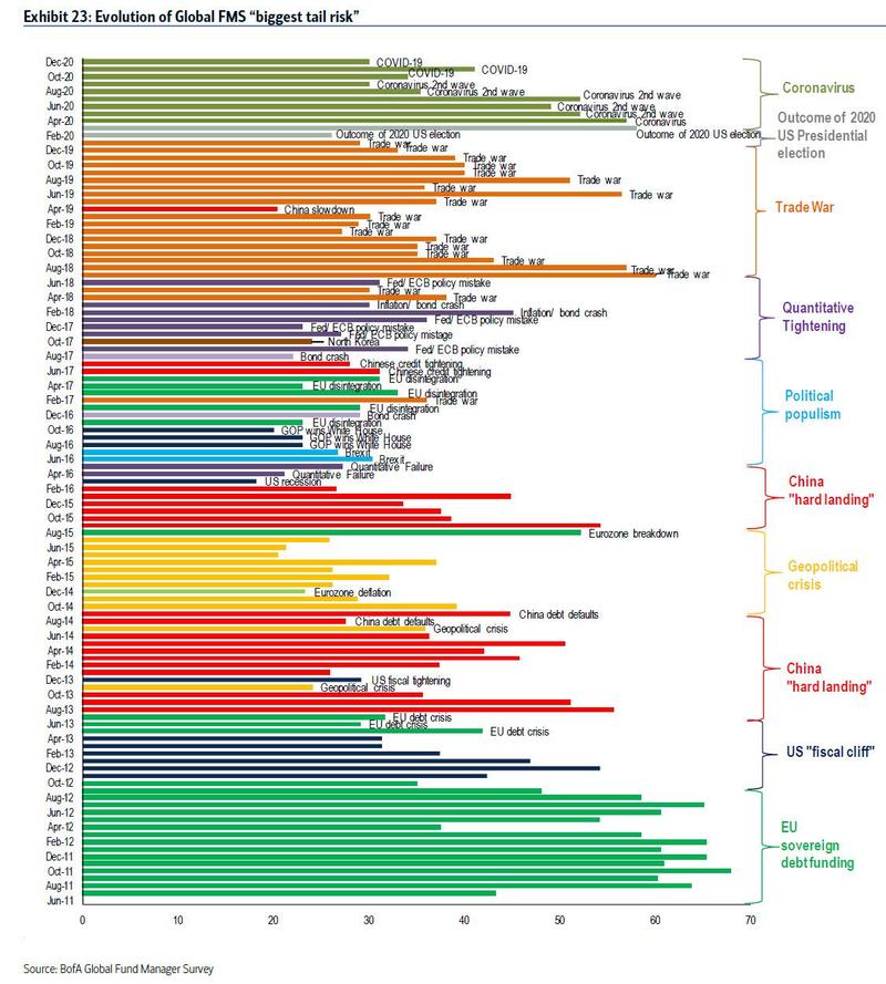 在最大的尾部风险方面,新冠疫情依然高居首位,人们对通货膨胀和财政政策拖累的担忧也有所增加。