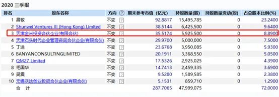 截至三季度末,天津金米仍然位列石头科技第三大股东之位,持股比例为8.89%。