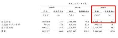 此外,蓝月亮线上销售占比不断增加,所产生的收益由 2017年的 1,866.5 百万港元上升至2018年的 2,718.2百万港元,并进一步上升至2019年的3,328.2百万港元,分别占我们总收益的33.1%、40.2%及47.2%。