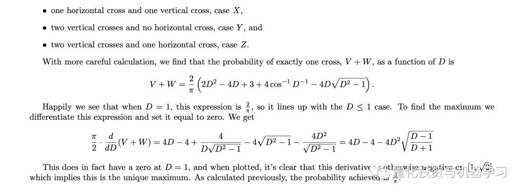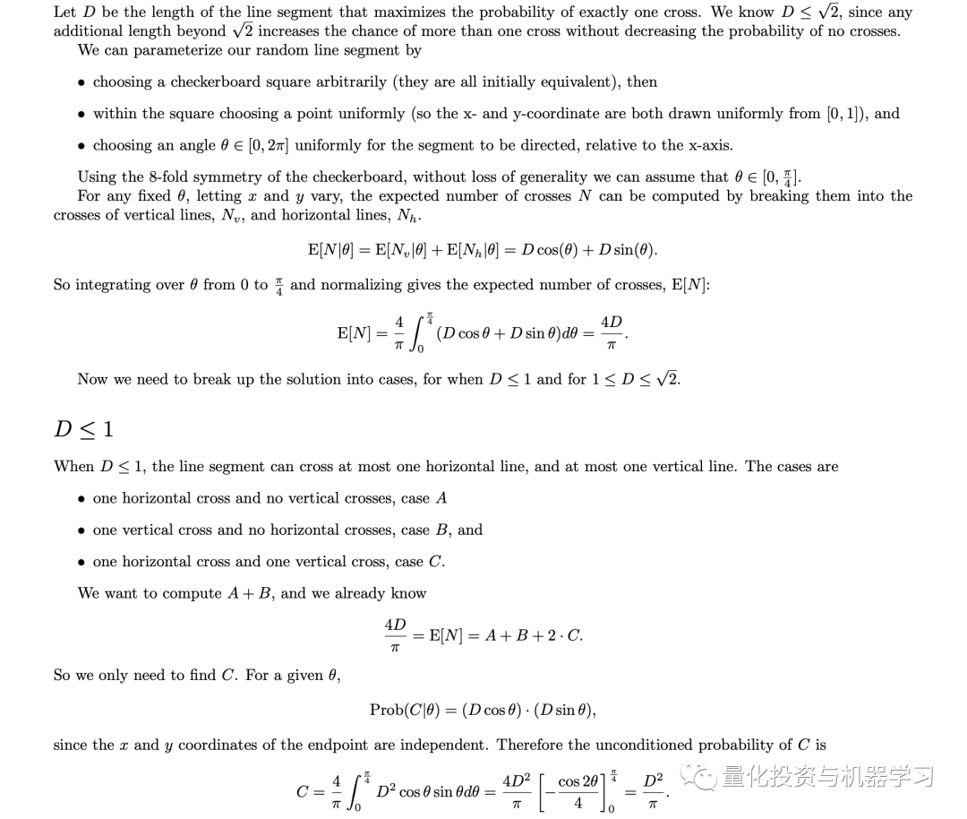 The answer to this puzzle is that D = 1 and the resulting probability is 2/pi (or about .6366).