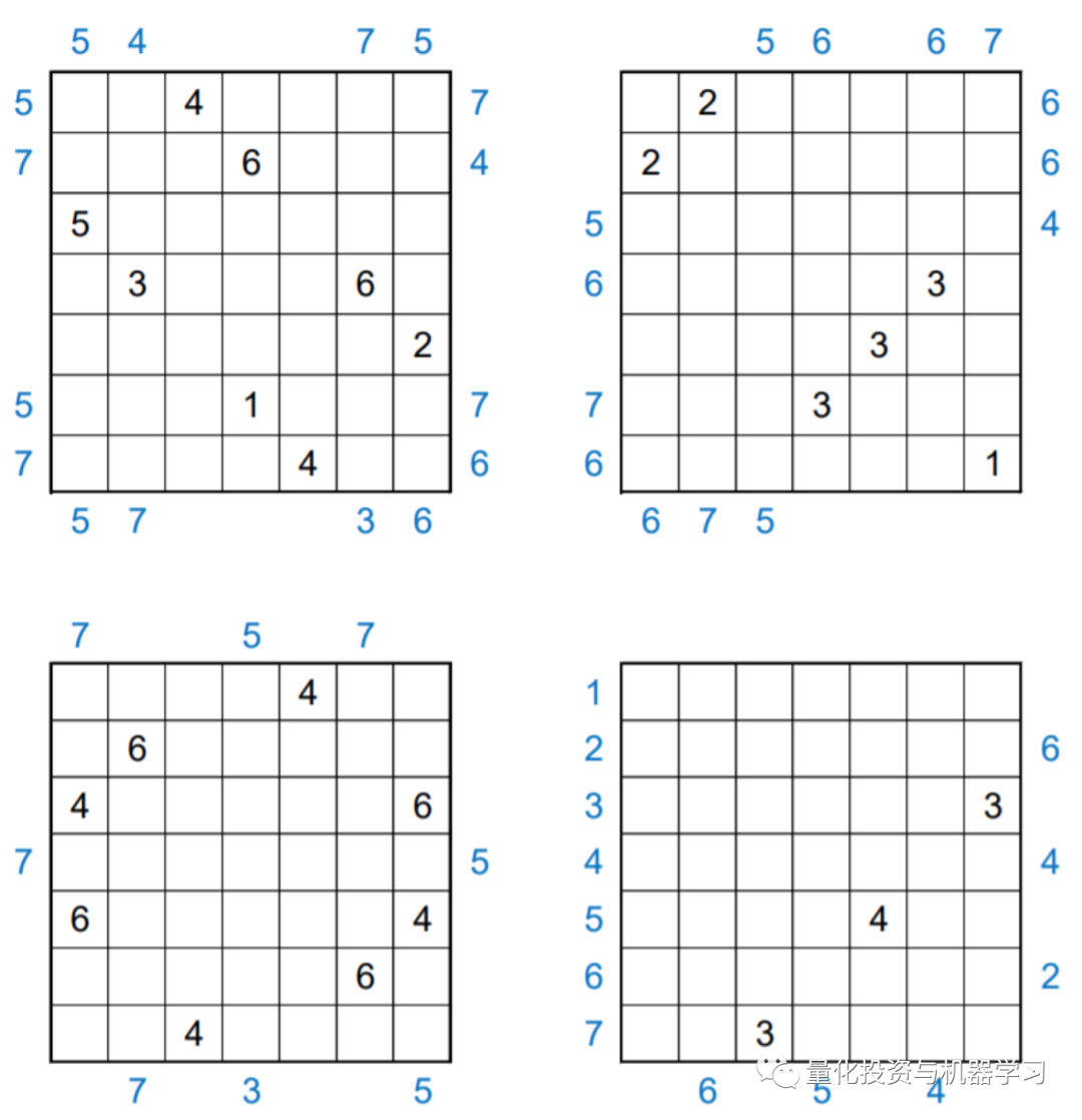 Some numbers have been placed inside each grid. Additionally, some blue numbers have been placed outside of the grids. These blue numbers indicate the first value seen in the corresponding row or column when looking into the grid from that location.