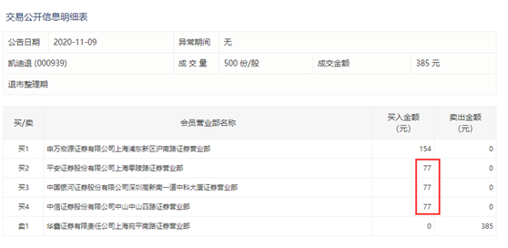 比如2020年11月9日,凯迪退全天仅成交5手,合计成交385元,其中几家营业部席位仅买入77元,就以跌停价格登上了龙虎榜。