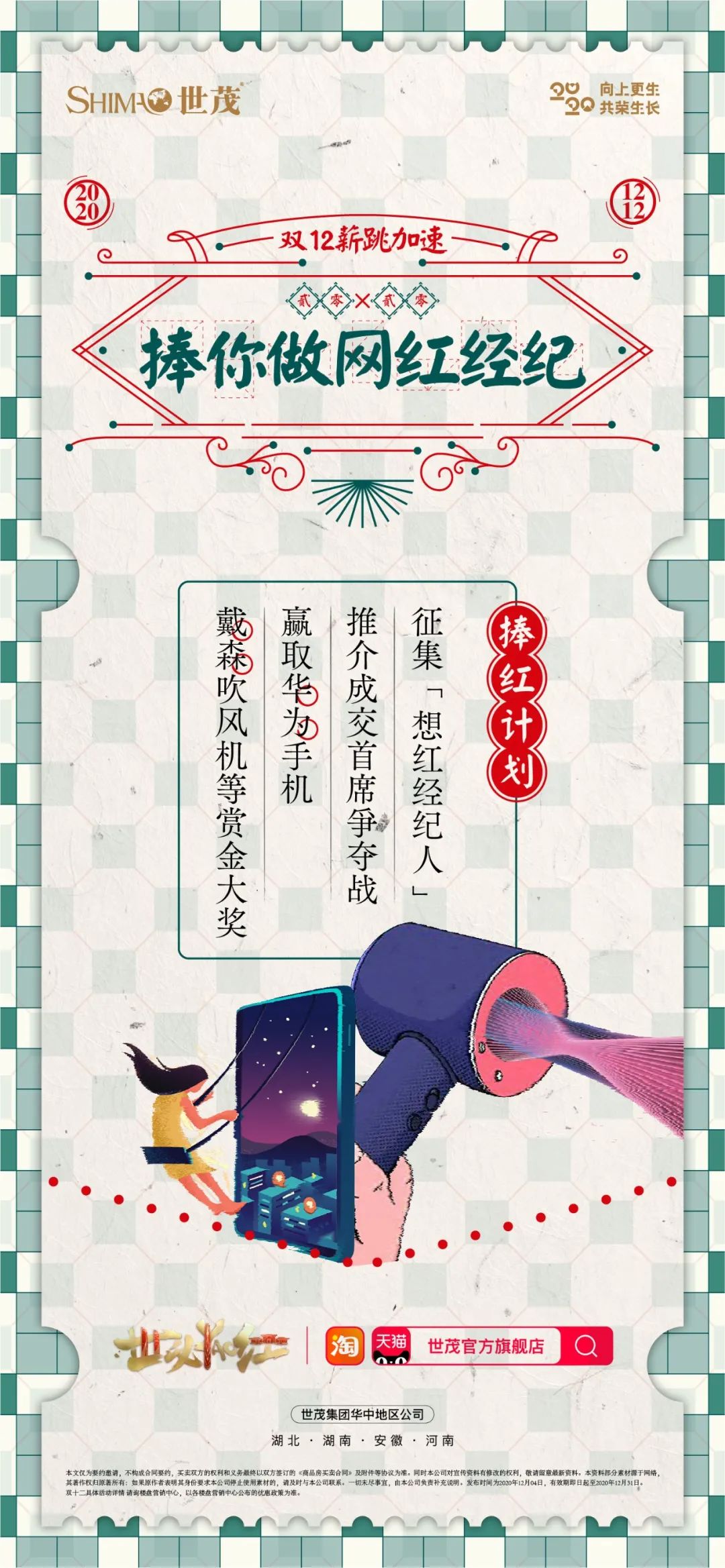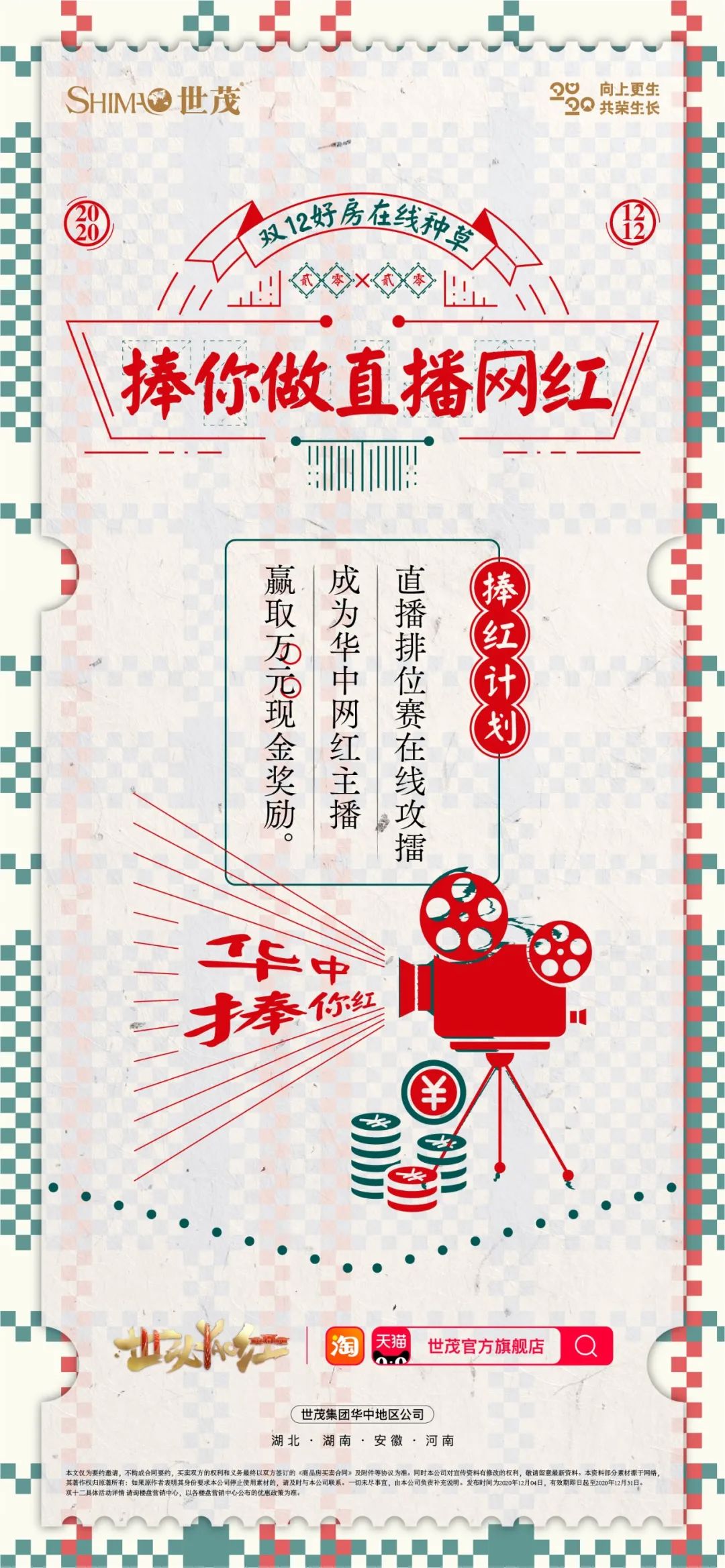 在双12“世必YAO红”的红学热潮下,华中世茂紧跟集团步伐,打造“华中世茂捧红计划”,4省8城16盘联动,多维度探索地产营销方式革新。华中世茂依托天猫官方旗舰店平台,以直播带货方式挖掘公域流量;针对地产经纪、置业顾问、客户多个端口定制“捧红计划”,实现创意营销出圈。