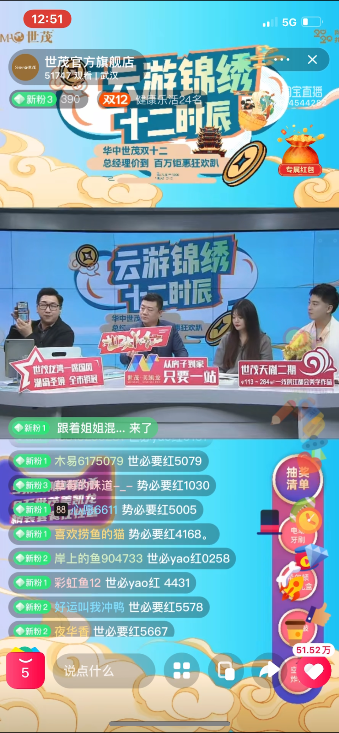 12月9日,华中世茂以“云游华中十二时辰”为主题,开启美食房产创意直播秀。直播设多个城市会场,带领观众于武汉、长沙、合肥、郑州四城间云游打卡,体味城市风土人情与特色美食。直播间打卡测评武汉地道小吃热干面、豆皮、烧卖,并为观众送出风靡全国的长沙网红奶茶“茶颜悦色”,直播4小时观看量达30.61万,点赞量达67.19万,直播期间成交金额超3000万。