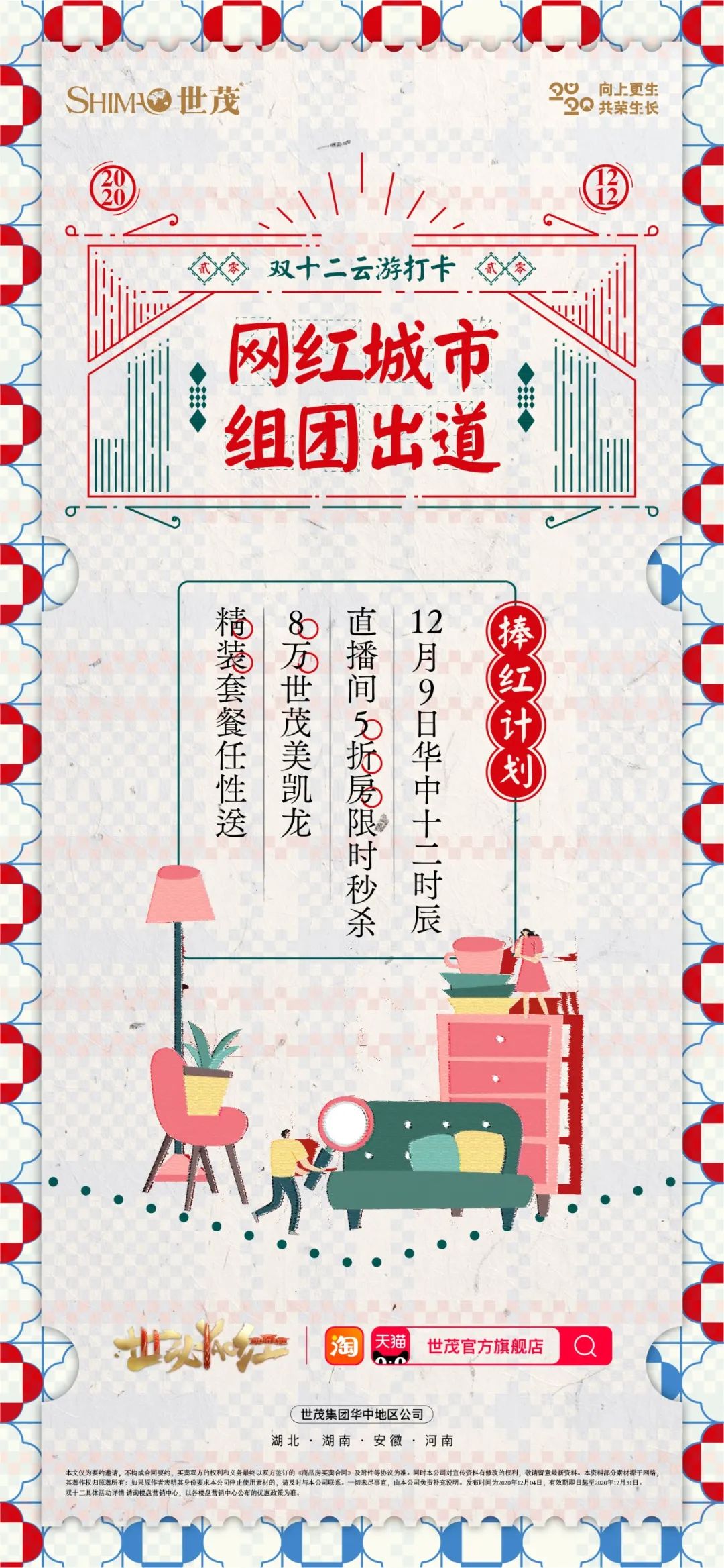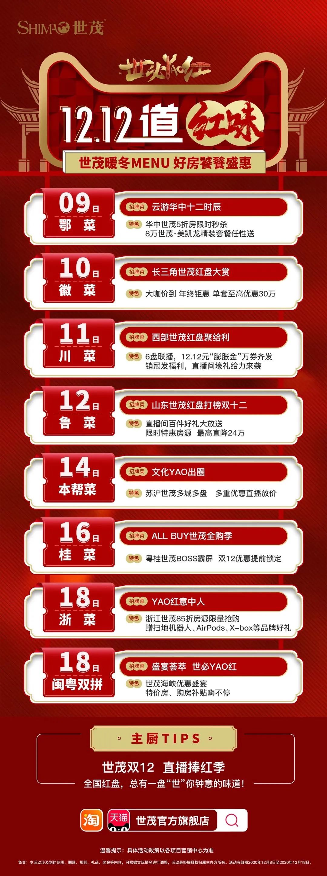 继双11世茂S级事件“就是YAO红"摇房节大促后,双12,世茂带着“红味”返场。双12期间购房最低7折起,半价购车位,直播间秒杀折上折,与17家世茂商业品牌商家联动。同时,推出世茂暖冬直播MENU——好房饕餮盛惠。由世茂地区公司领衔,推出洋溢着地域特色的9天地区公司品牌日直播,带茂粉领略天南海北的世茂好房、美景、美食。系列直播从12月9日起至12月28日结束,共计30场旗舰店官方直播、85场导购带货直播。
