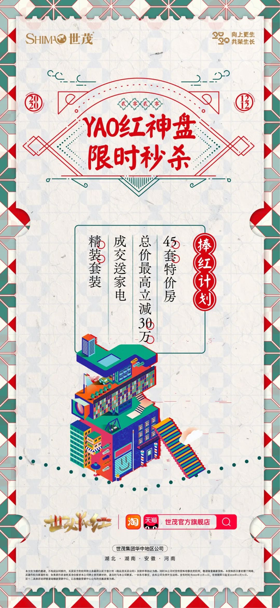 世茂延续双11“就世YAO红”的出圈营销,双12以“世必YAO红”为主题,冲刺年终倒计时。同时携手天猫好房、世好房小程序等平台释放购房红利,以当红姿态在全国各项目铺开营销动作。