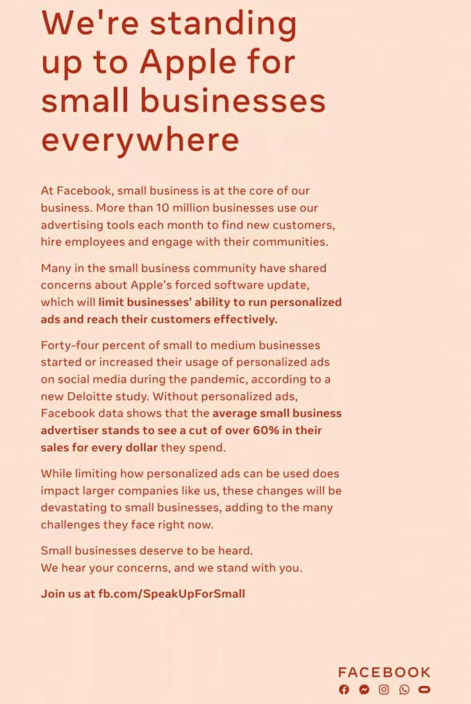 Facebook在知名媒体上刊登平面和数字广告,称:“为了世界各地的小企业,我们正与苹果对抗。”它还开设了一个新网站,介绍即将发布的iOS 14变化,该变化将影响应用程序如何使用带有苹果广告标识符IDFA的广告跟踪工具。
