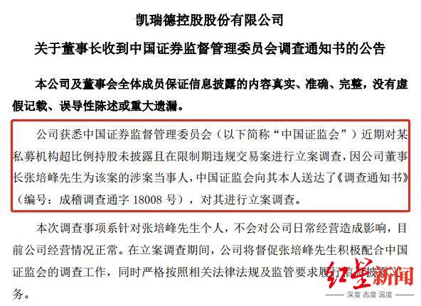 2018年7月20日,凯瑞德公告,终止收购北京乐盟互动科技有限公司51%股权;同时董事长张培峰被立案调查。随后,凯瑞德收到金华市公安局出具的《指定居所监视居住通知书》,获悉董事长张培峰、监事会主席饶大程因涉嫌操纵证券市场案分别在2018年7月19日、7月18日被执行指定居所监视居住。