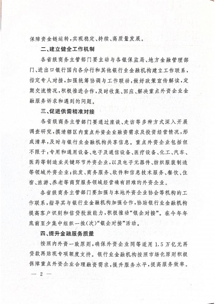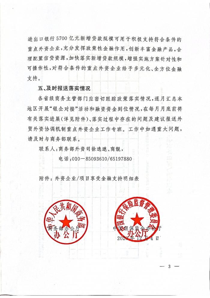 12月10日,商务部办公厅、银保监会办公厅联合印发《关于贯彻落实国务院部署给予重点外资企业金融支持有关工作的通知》,指导各地商务主管部门和银保监局做好《国务院办公厅关于进一步做好稳外贸稳外资工作的意见》(国办发〔2020〕28号)落实工作,加大对重点外资企业金融支持力度。《通知》提出,要强化金融支持稳外资作用,进一步提高金融支持政策精准性、直达性,帮助重点外资企业应对疫情冲击、化解融资难题。《通知》要求,各地要建立健全工作机制,强化工作联动,及时、全面了解重点外资企业融资需求及投资经营情况,举办“银企对接”活动,促进供需精准对接,提升金融服务质量。
