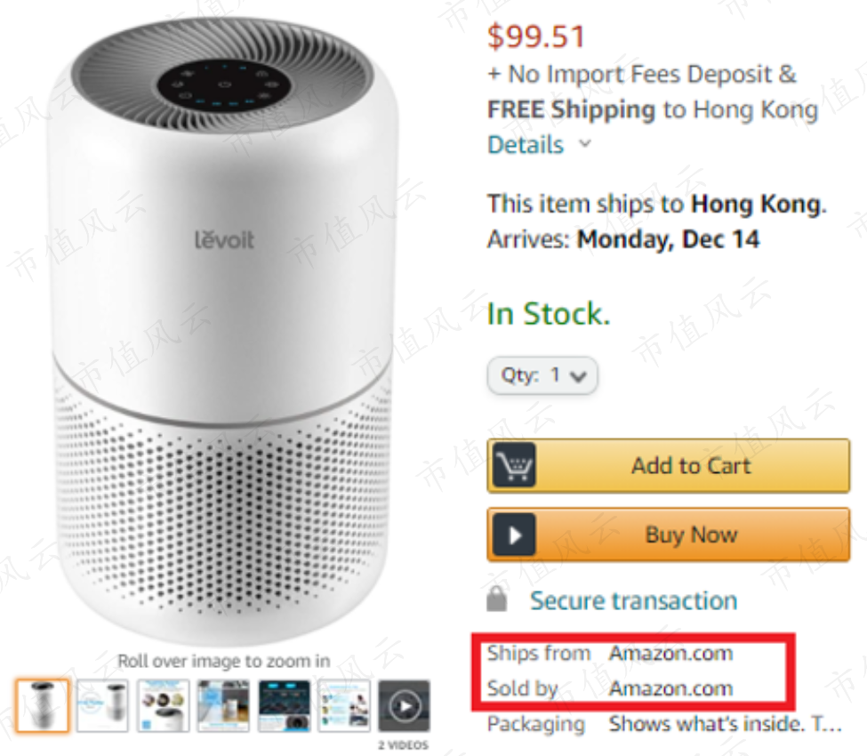 下图显示的是Vesync旗下Levoit品牌的某一款空气净化器,在展示页面的右下角我们可以看到“Ships from Amazon.com, Sold by Amazon.com”的字样,有了这个字样,就说明该产品是亚马逊自营的商品,背后体现的是Levoit先把商品卖给亚马逊,然后亚马逊再将商品,转卖给消费者的业务流程。