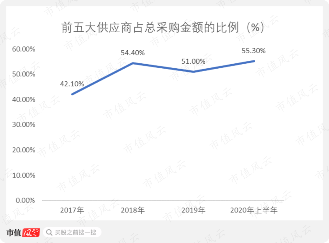 Vesync的供应商包括分包商以及原材料供应商,前五大供应商占总采购金额的比例从2017年的42.1%上升至2020年上半年的55.3%,供应商集中度有变高的趋势。