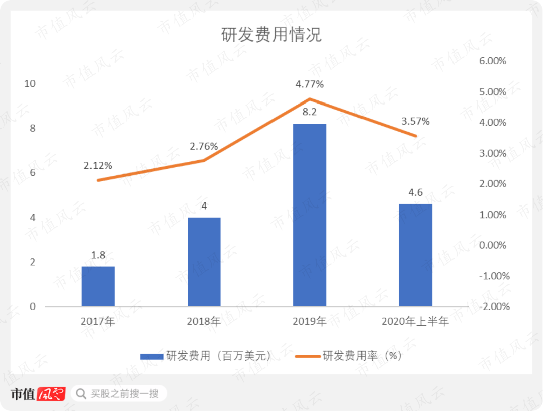 2017-2019年,Vesync的研发费用从180万美元增长至820万美元,研发费用率也从2.12%增长至4.77%,这说明公司正在加大力度搞研发和设计,今年上半年的研发费用就达到了460万美元,研发费用率为3.57%。