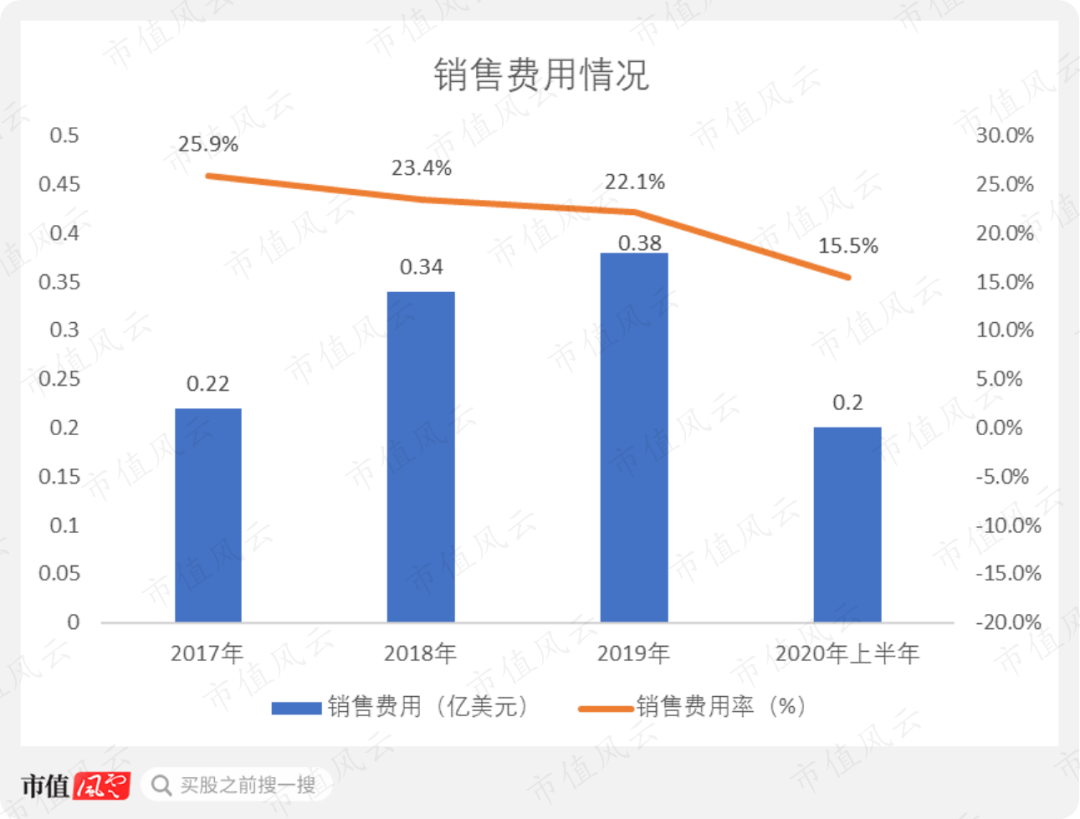 另外,销售费用是Vesync最大的费用性开支,2017-2019年,销售费用从0.22亿美元增长至0.38亿美元,销售费用率虽然从2017年的25.9%一路下滑至2020年上半年的15.5%,但依然是Vesync最高的费用率,远比研发费用率要高。
