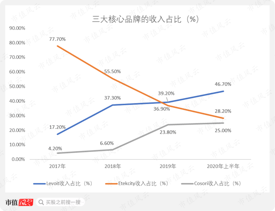 我们再来看看各个品牌的收入占比情况,2017-2020年上半年,Levoit品牌收入占营业收入的比例从17.2%增长至46.7%,Cosori品牌收入占比从4.2%一路上涨至25%,至于Etekcity,其品牌收入占营业收入的比例从77.7%大幅下滑至28.2%。
