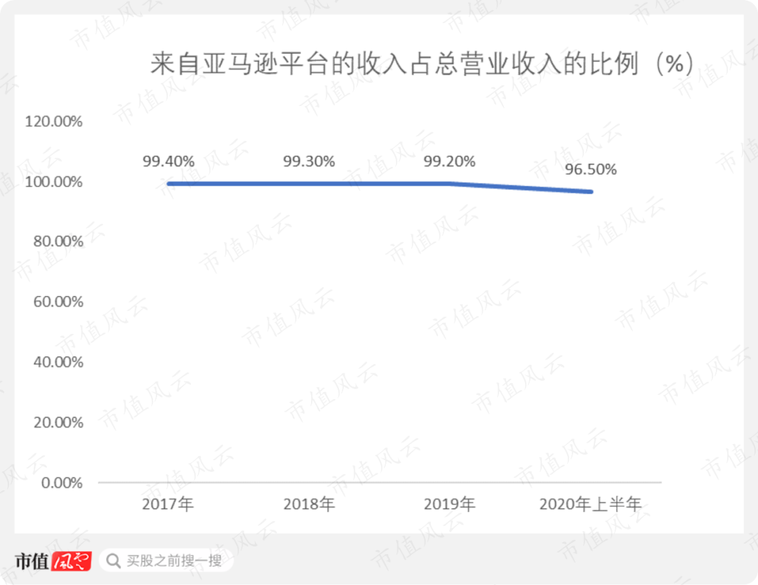 按渠道划分,亚马逊妥妥是Vesync最大的销售渠道。2017-2020年上半年,来自亚马逊平台的收入占总营业收入的比例从来没有低于95%。