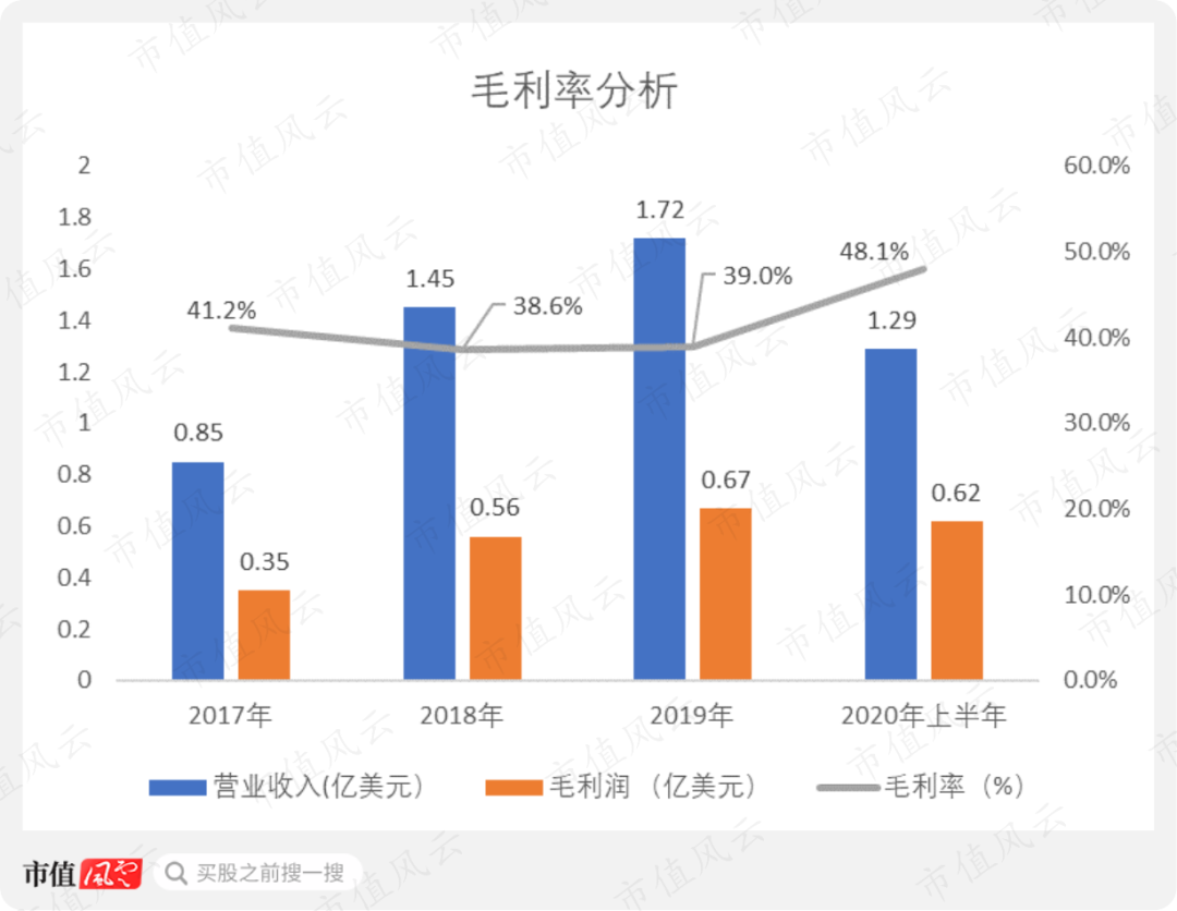 今年上半年,公司的营业收入和毛利润分别达到1.29和0.62亿美元,整体的毛利率水平在2017-2020年上半年期间,一直保持在40%左右,较为稳定。
