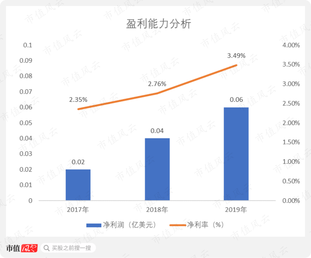 如果只看2017至2019年期间的话,那公司的盈利能力是真心不咋地:净利润从0.02亿美元增加至0.06亿美元。看起来好像业绩增幅很大,累计增长了200%,可是,要知道公司的营业收入已经超过1亿美元,而最后的净利润只有几百万美元,净利率明显偏低。