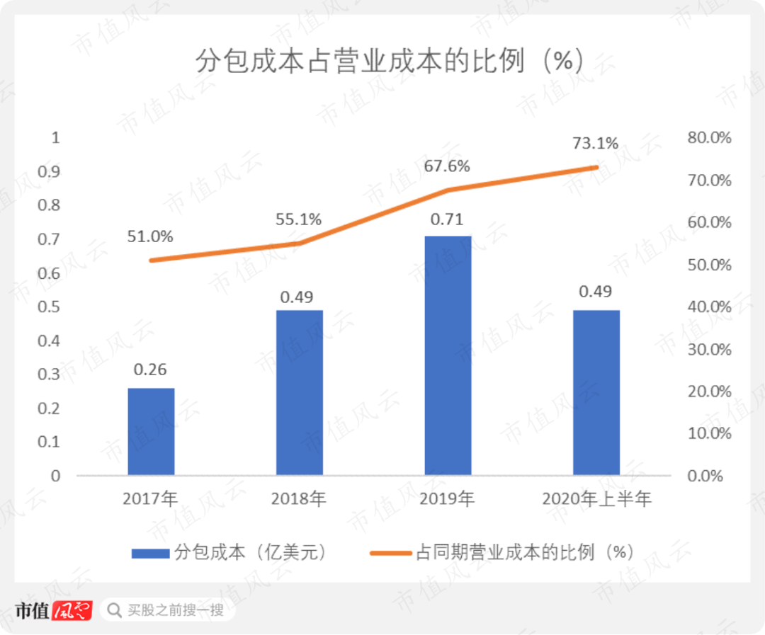 2017-2019年,分包成本从0.26亿美元增长至0.71亿美元,分包成本占营业成本的比重从2017年的51%一路增加到今年上半年的73.1%。
